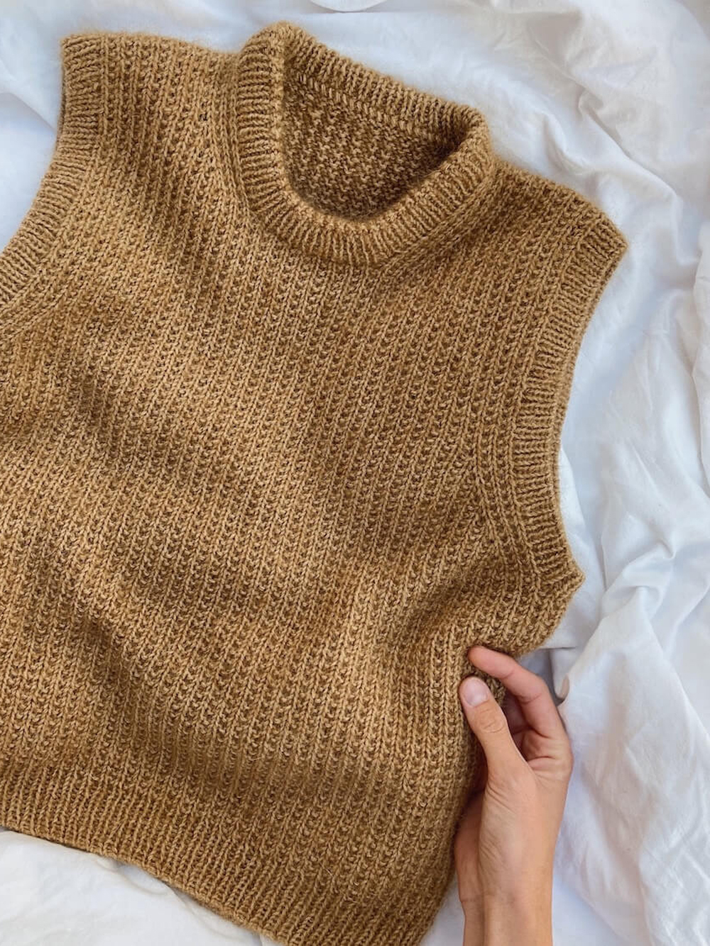 Friday Slipover strikkes ovenfra og ned i perleribb. Først strikkes bakstykket, så skuldre og forstykket og til slutt bolen. Langs halsåpning og ermehull strikkes det til slutt ribbkanter.