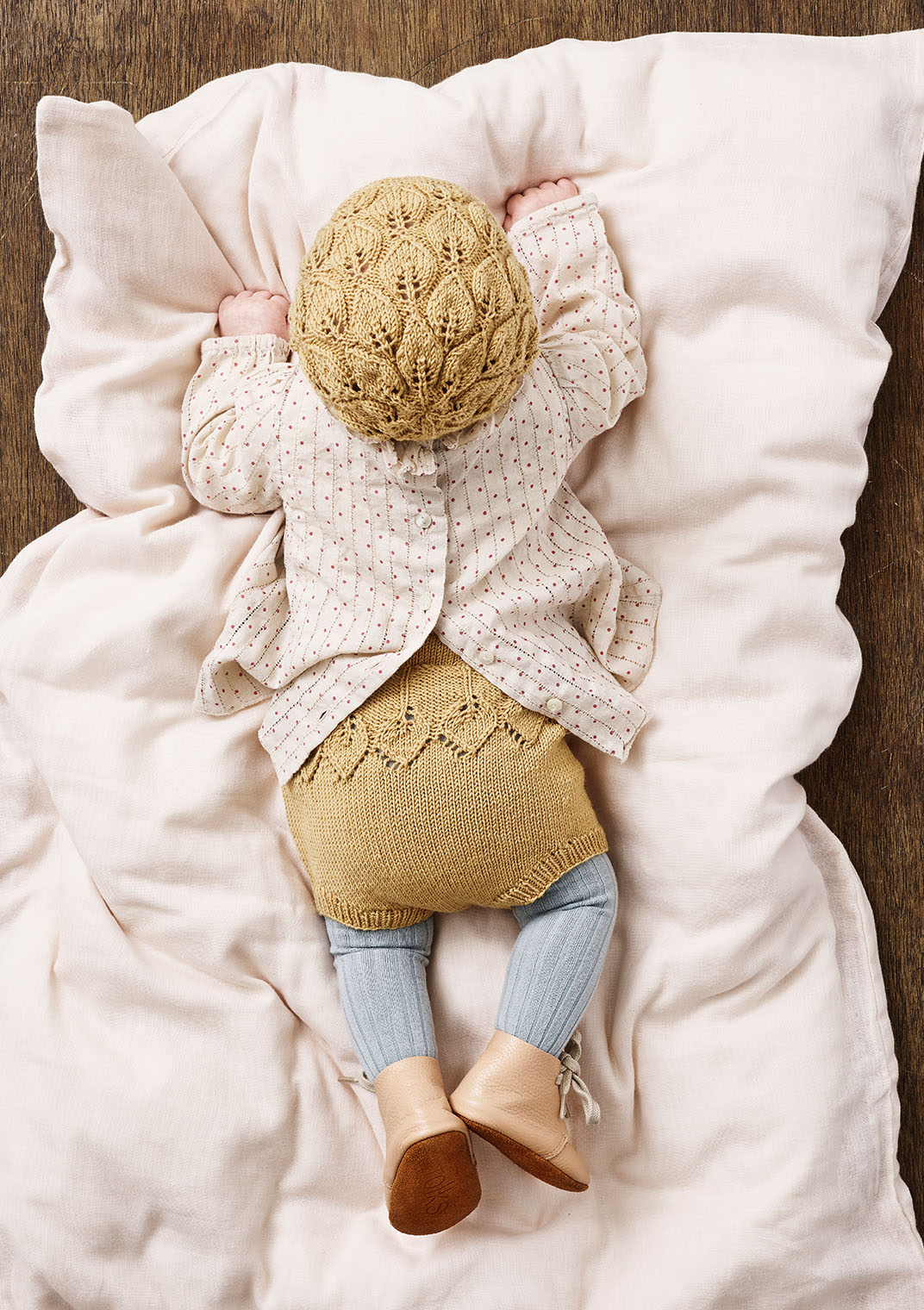 Kysen er frodig med mange blader, mens bleiebuksen bare har en enkelt rad med blader langs den øverste kanten. Begge deler passer perfekt til resten av Bella-serien, og strikkes også i garn som passer til pinde 3.