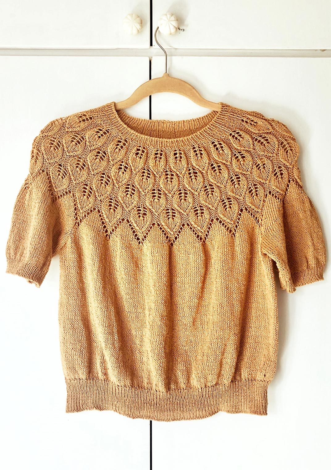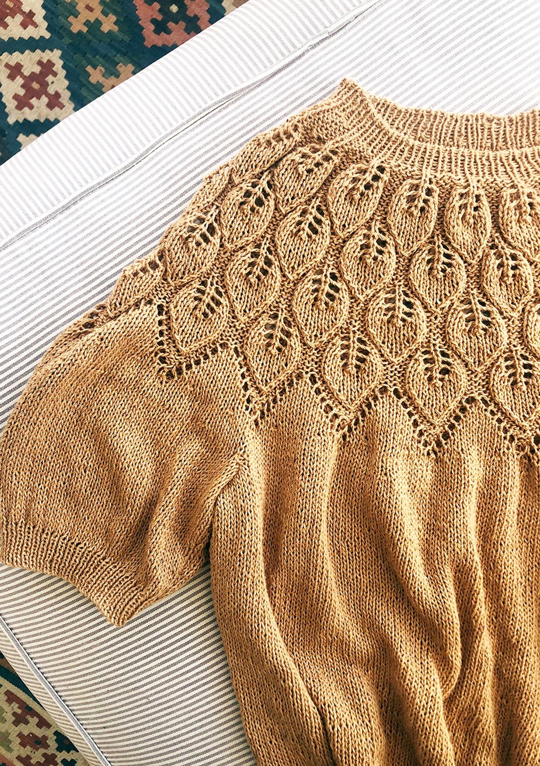 Bladmønsteret på bærestykket er morsomt å strikke, og det gir også en fin passform fordi kombinasjonen av rett- og vrangmasker er så elastisk. Ella Shirt er strikket ovenfra og ned, og er strikket høyere bak enn foran.