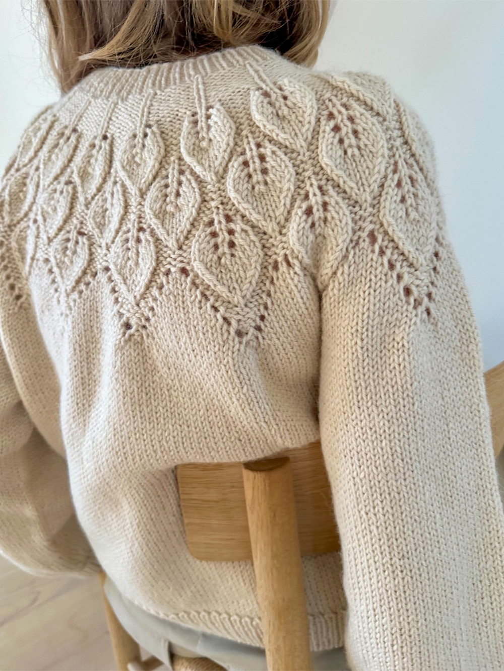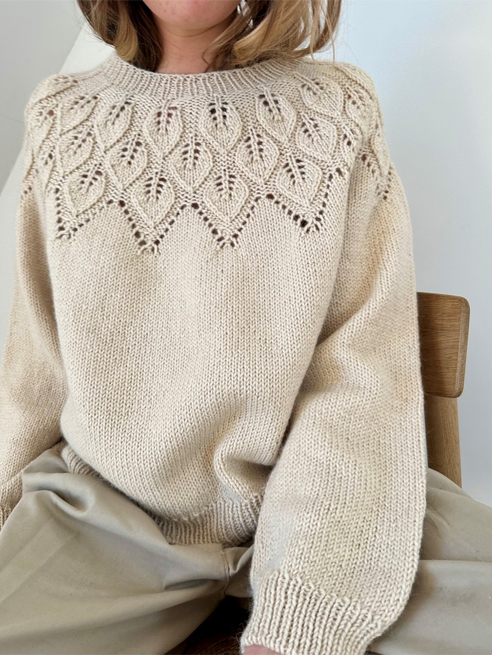 Det bladmønstrede bærestykke er underholdende at strikke og giver samtidig en fin pasform, fordi kombinationen af ret- og vrang-masker er så elastisk. Ella Sweater er strikket oppefra, og er strikket højere i nakken ved hjælp af vendepinde.