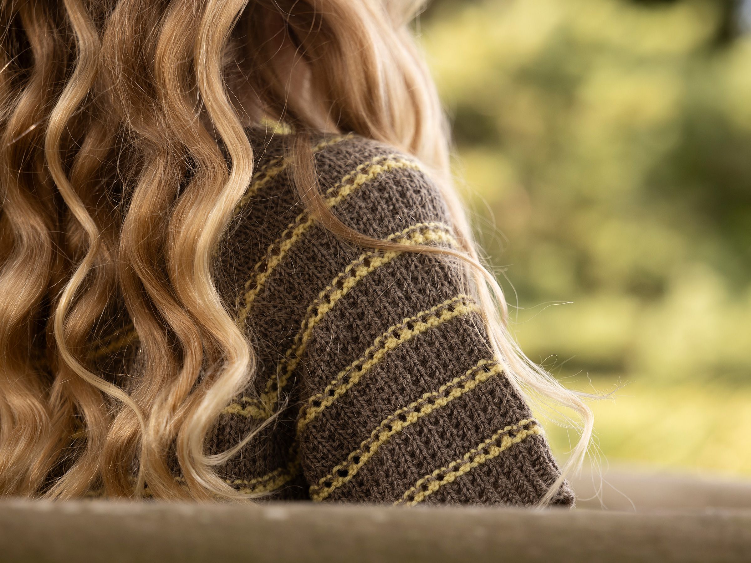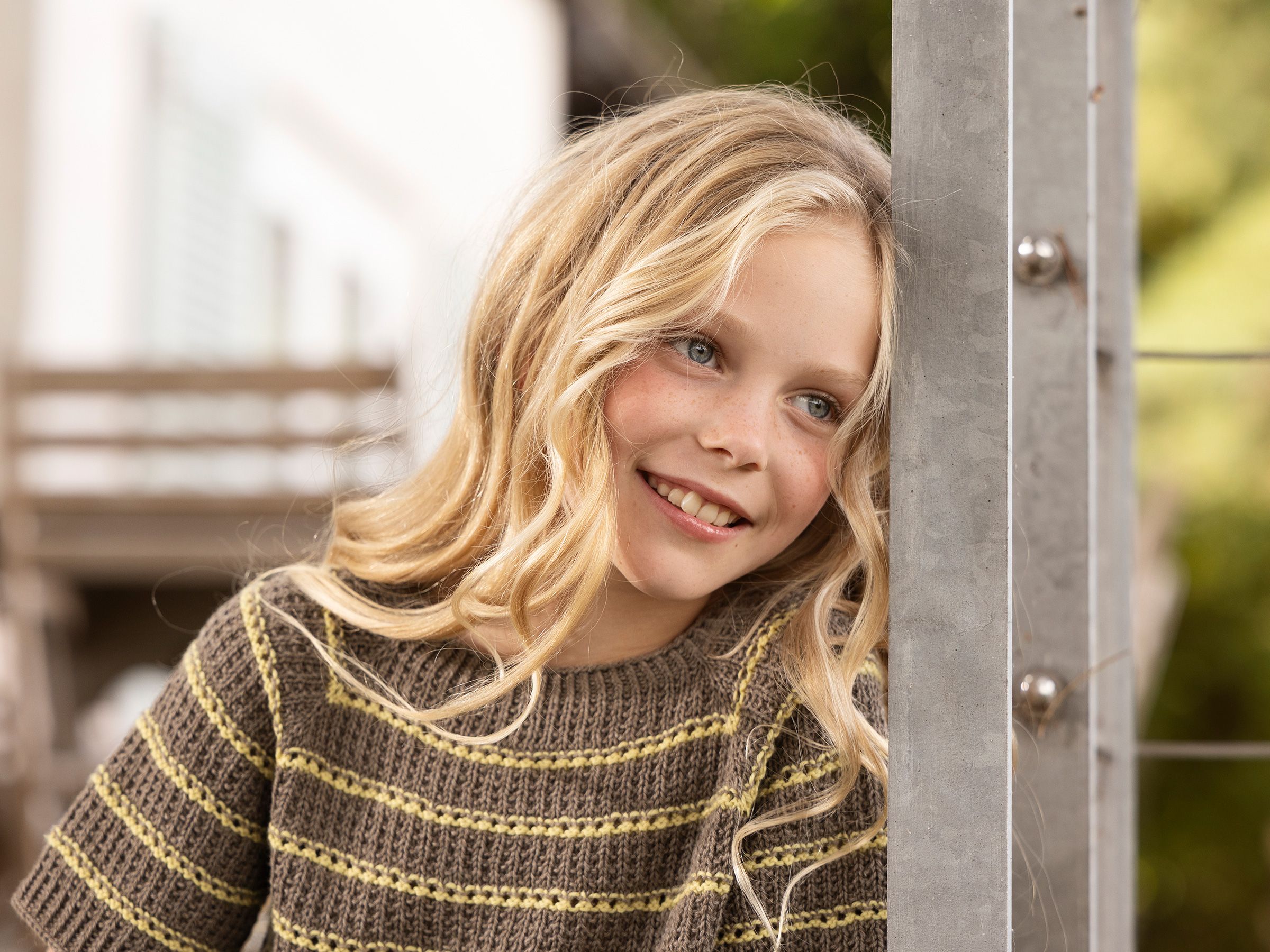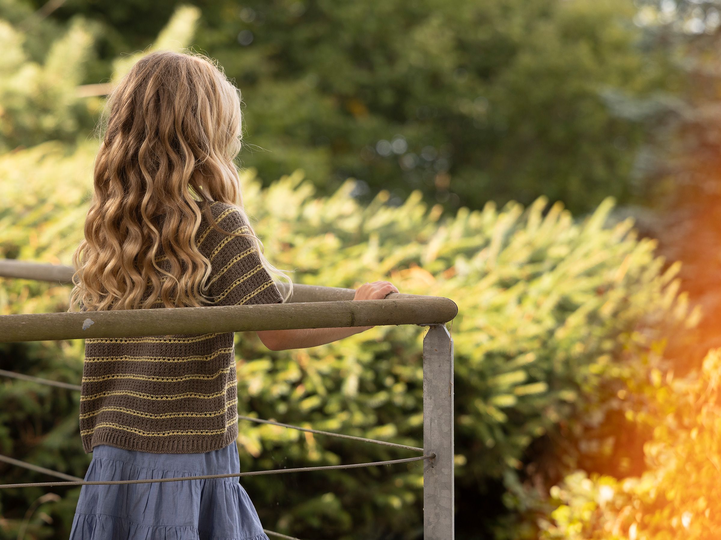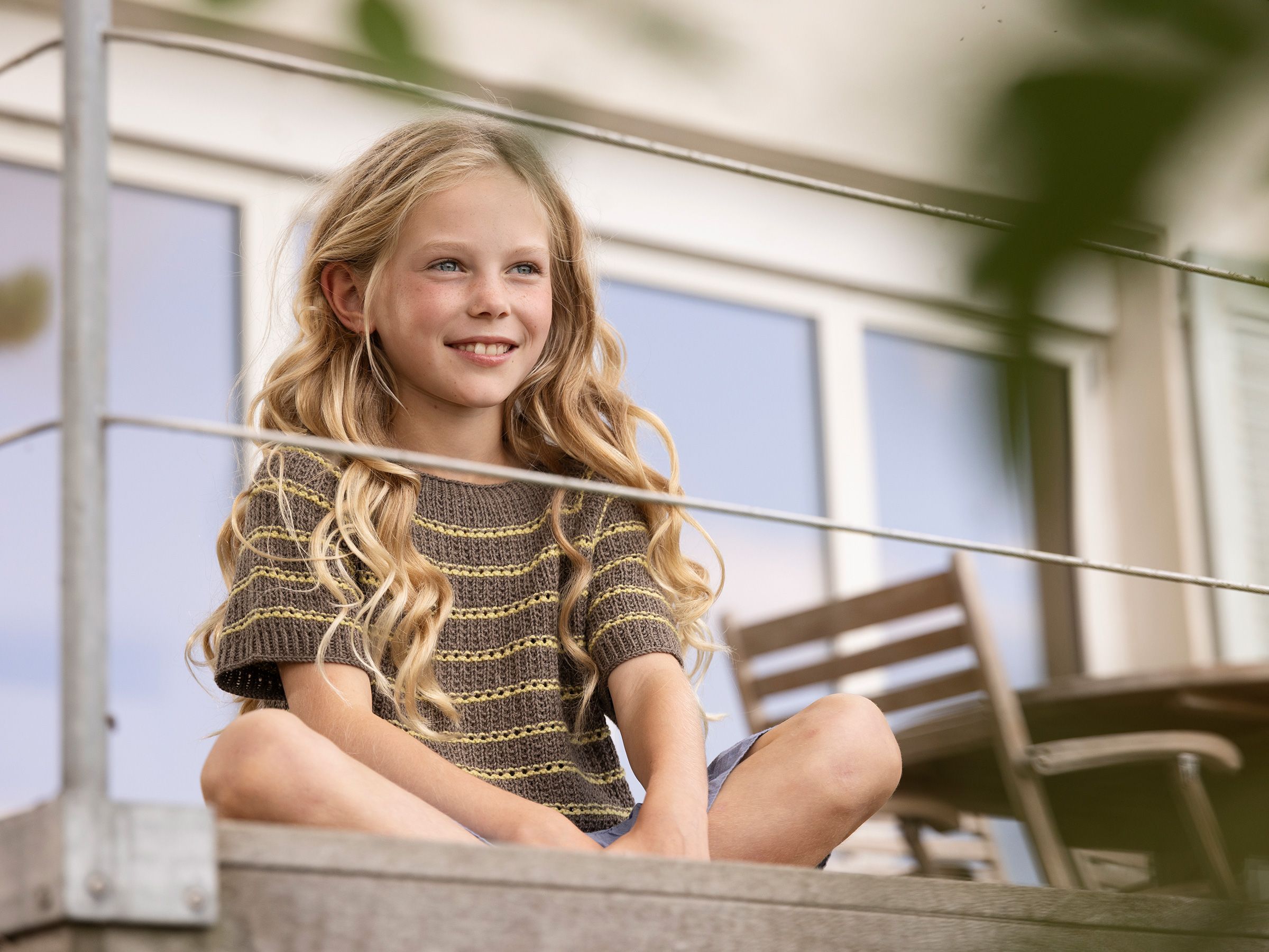 På en lun sommerdag ved fjorden smelter vann og himmel sammen i horisonten. Varmen fra solen får luften til å sitre, mens små føtter plasker i vannkanten. Stripene er strikket i et enkelt og fint hullmønster.