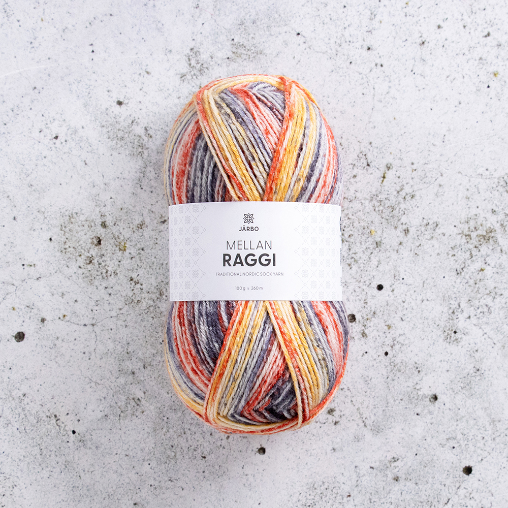 Raggi er sokkegarnets stamfar og Järbos stolthet. Mellanraggi er «mellombarnet» i Raggi-familien! Akkurat som den tykkere Raggi inneholder Mellanraggi en blanding av superwashbehandlet ull og polyamid, noe som gjør garnet slitesterkt og holdbart. Derfor er det spesielt godt egnet til sokker. Raggi-familien består av en hel haug med garn, alle spesielt utviklet for å være egnet til sokkestrikking, men også til andre typer plagg.
